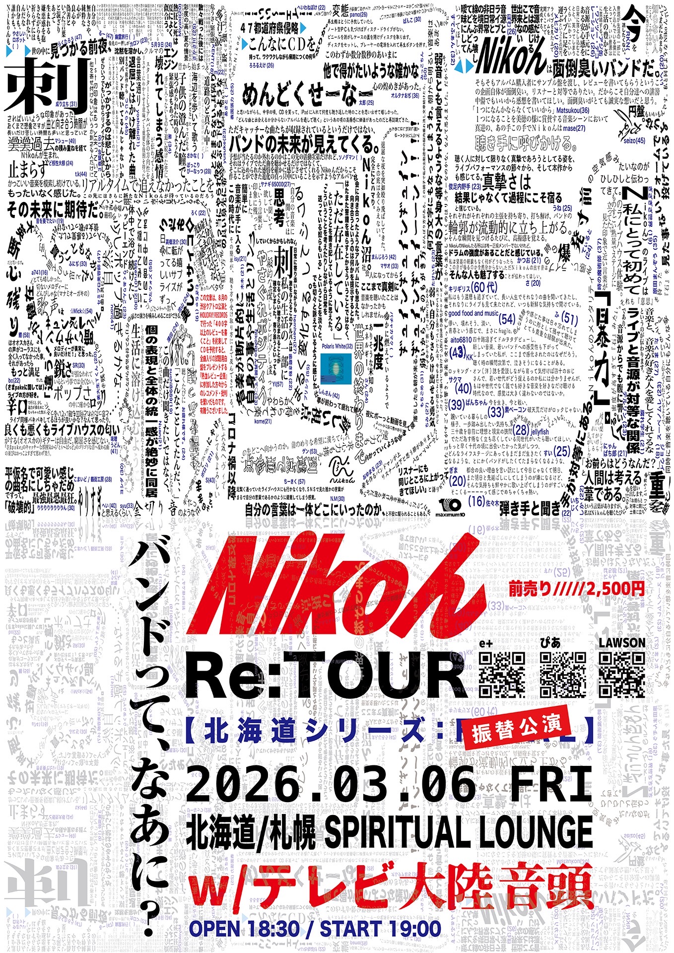 先日開催を延期いたしましたNikoん「Re:TOUR」札幌SPIRITUAL LOUNGE公演ですが、