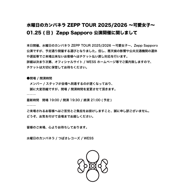 【水曜日のカンパネラ】01.25(日)札幌公演についてのご案内