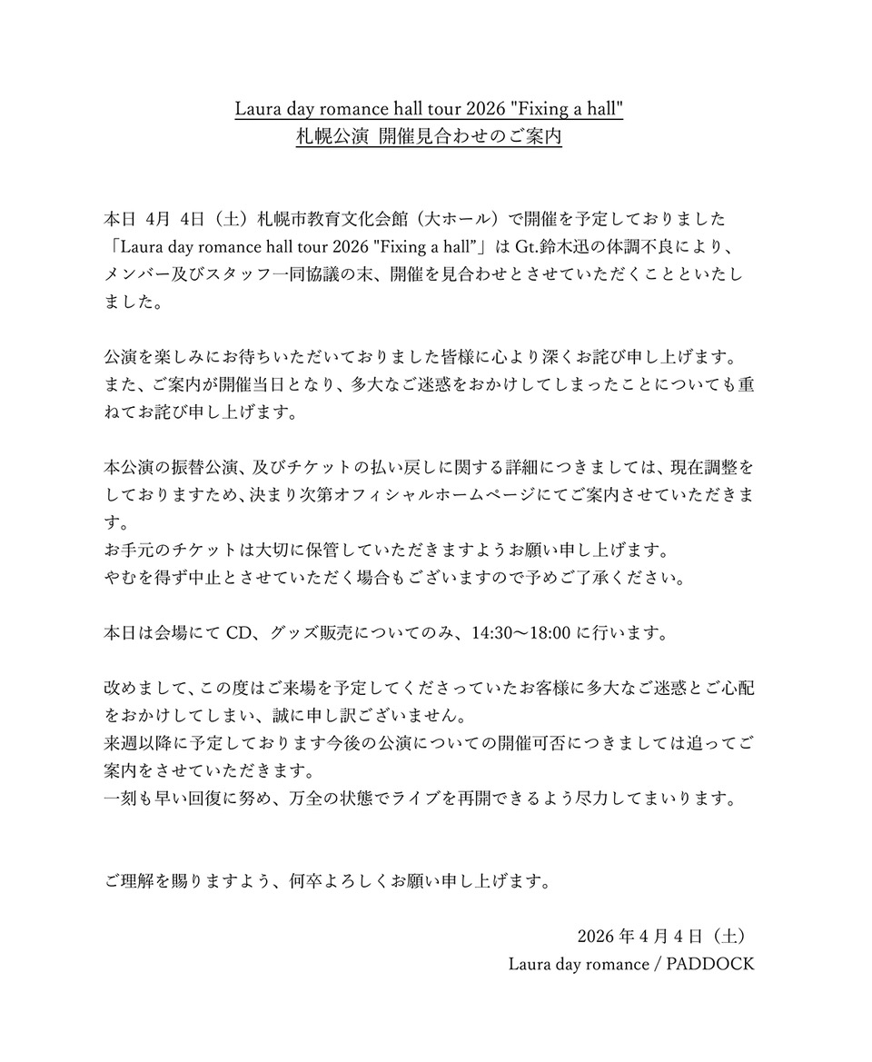 【Laura day romance】04.04(土)札幌公演 開催見合わせのお知らせ